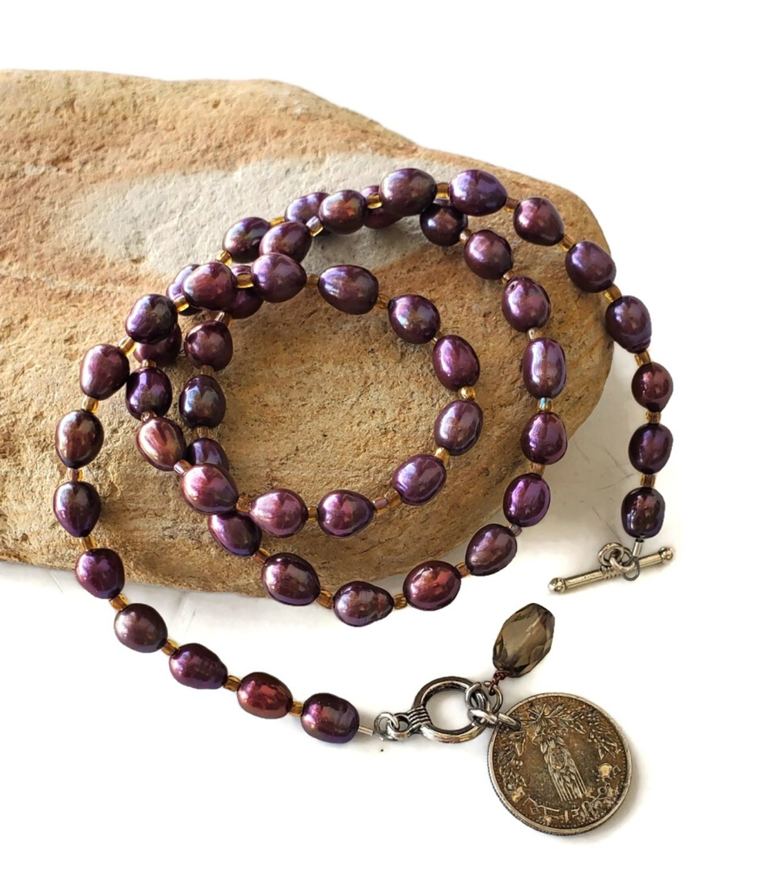 A lustrous stand of purple freshwater pearls turned into a 1971 Syria Coin necklace. Beautiful pearls give this piece sophistication and class. This meaningful coin showcases her family heritage. The smokey topaz stone in front is a birthstone for this gal. A keepsake piece of jewelry that can be passed to down.