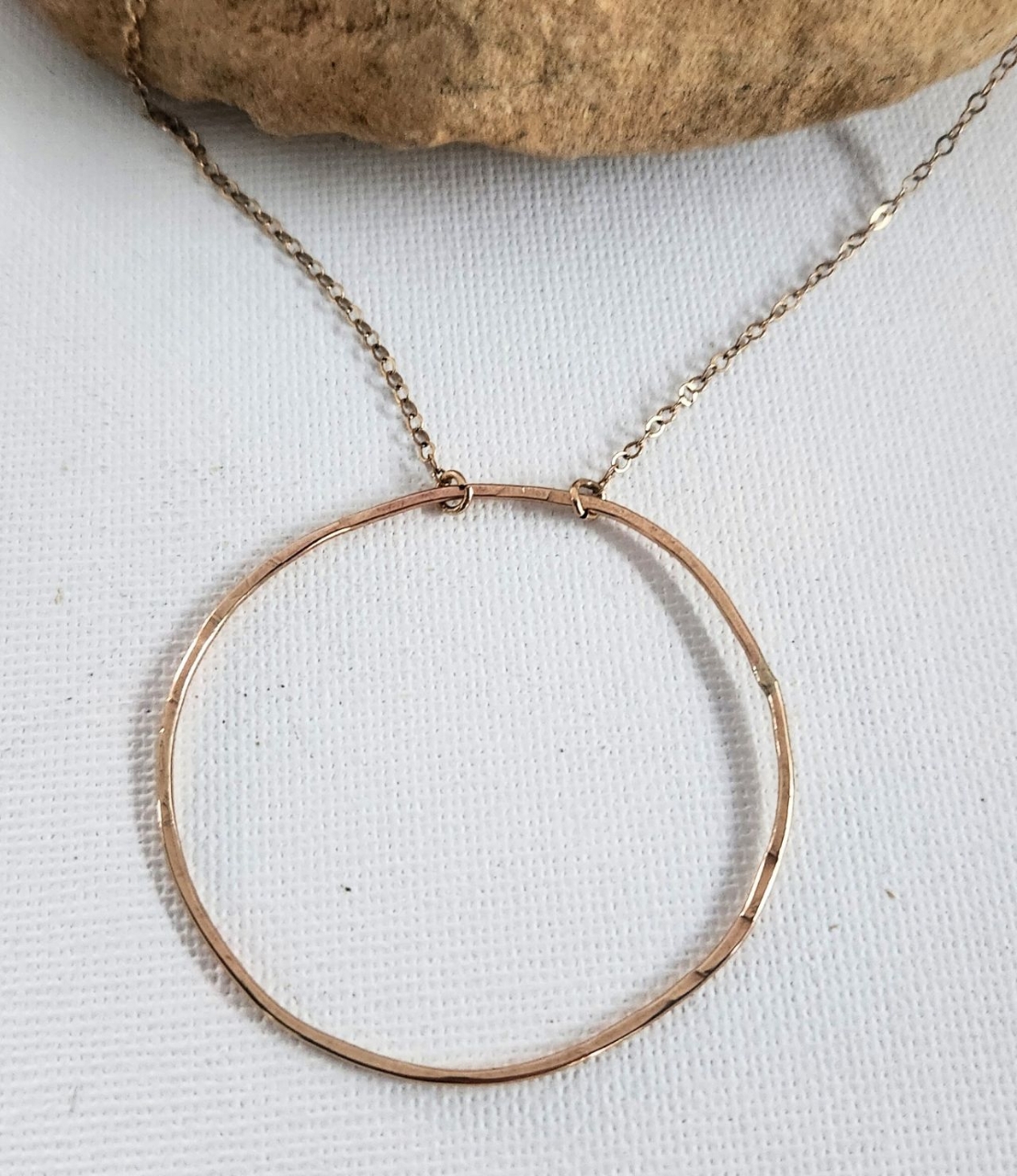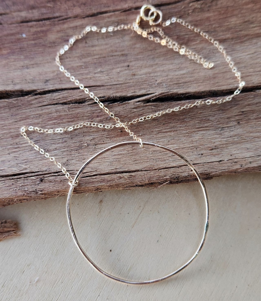 A delicate statement making, big, gold circle necklace. Lightly hammered, organicly round in shape, beautifully simple. This circle represents the cycle of cause and effect - getting what you give.