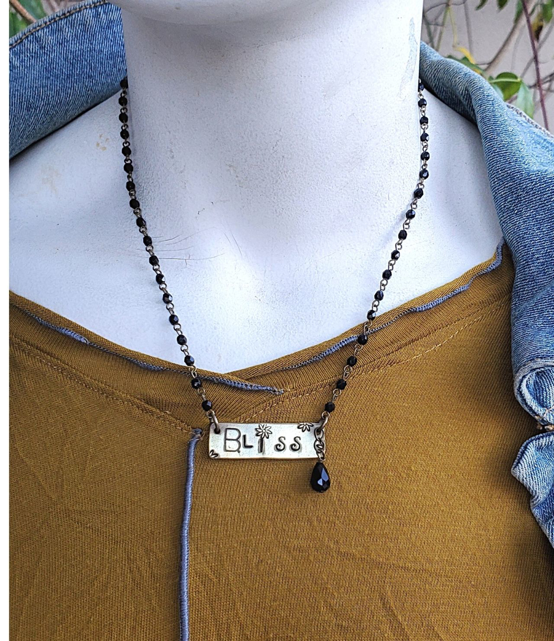 Bliss. Be reminded to find your bliss everyday with my bliss tag black beaded chain necklace. Bliss is about reachig a state of perfect happiness. Just to be aware of little moments of throughout your day that feel good. Wearing this can be your mantra for the day.
