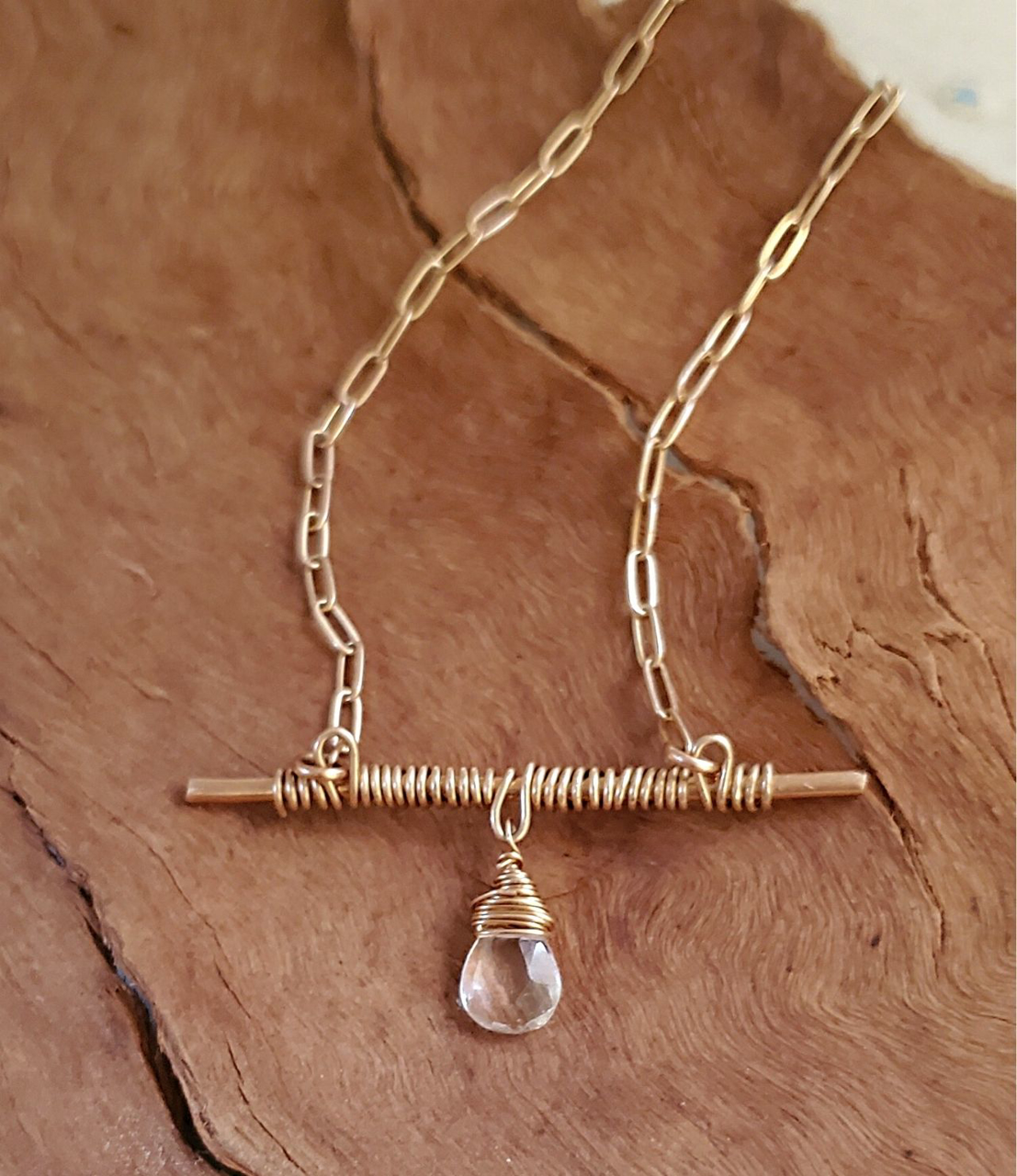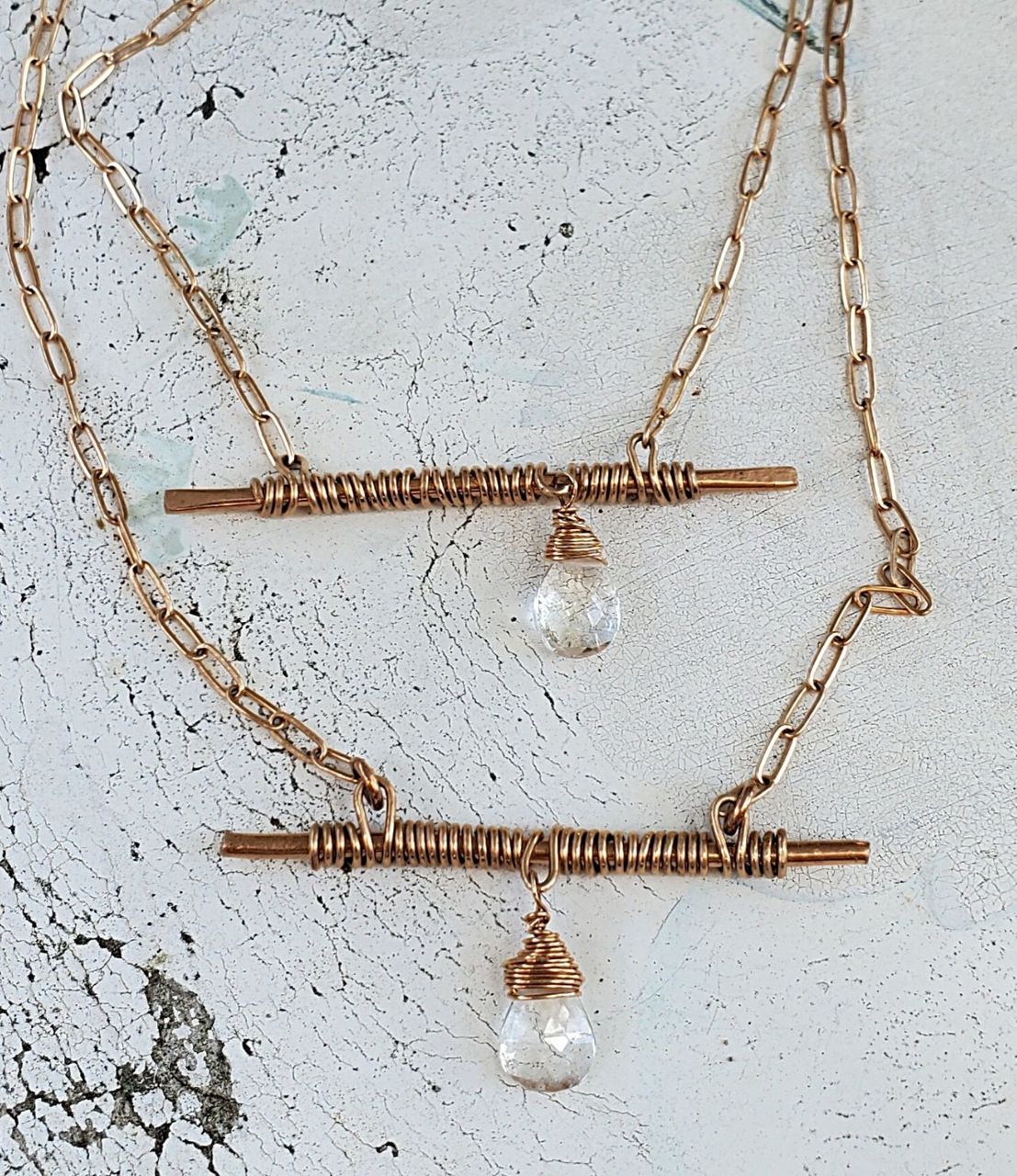 Bar none is how you'll feel wearing this simple (but oh so eye catching) necklace. A wire wrapped bronze bar with a sweet diamond quartz stone that hangs from bronze paperclip chain. She is super pretty worn alone but is also a great one for layering. And you have options