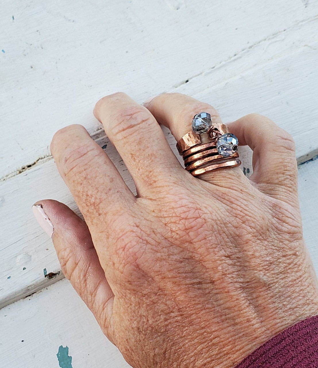 Your fingers will enjoyed the benefits of wearing a coiled copper ring on any finger. Hand forged solid copper is loaded with antimicrobial benefits to help keep you protected. Easy to wear on your pointer, middle and ring fingers. Also stacks well with others! (see photo)
