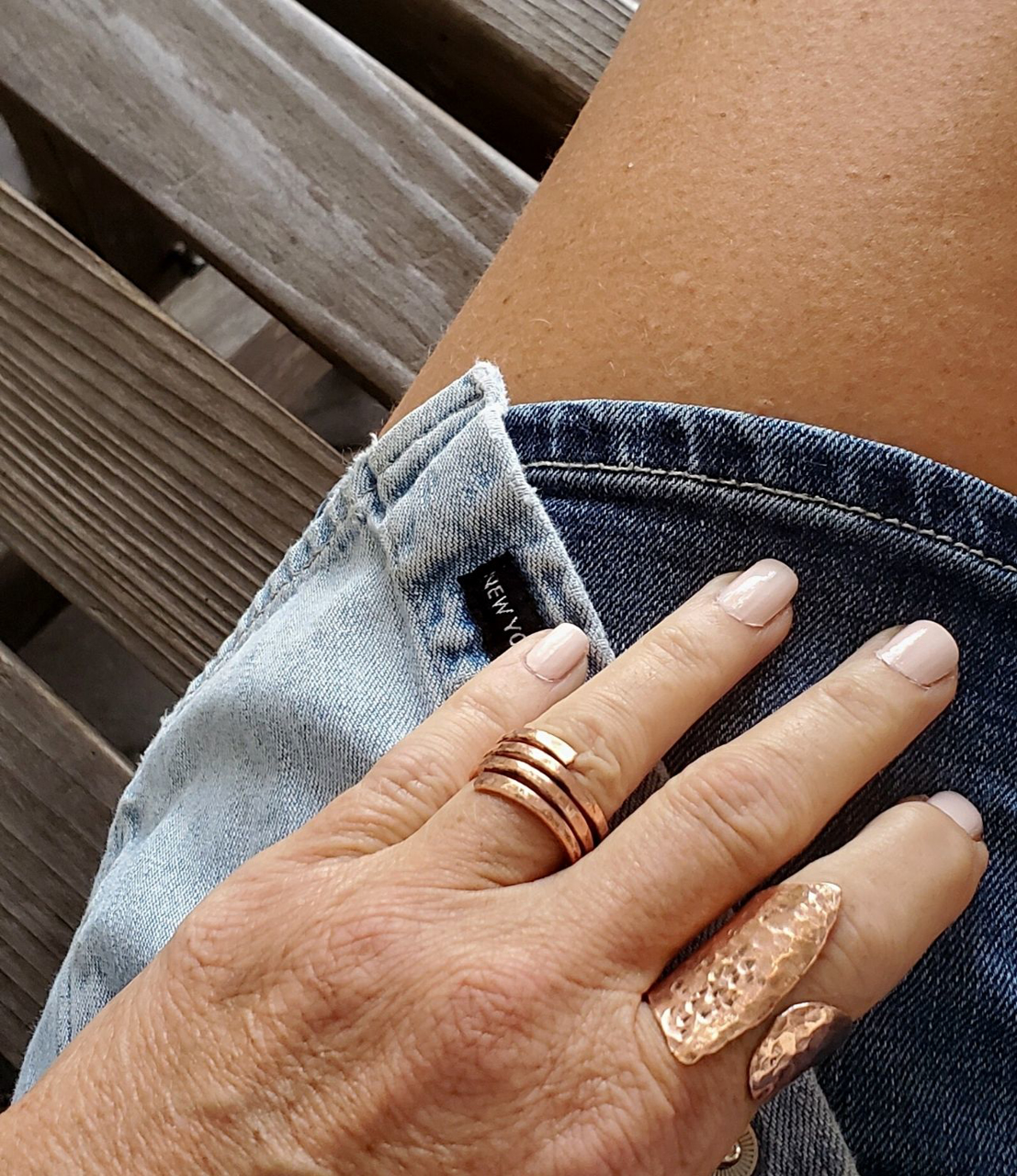 Ride the wave wrap ring in hammered copper or brass metal. This ring looks particularly good on your middle and pointer fingers.