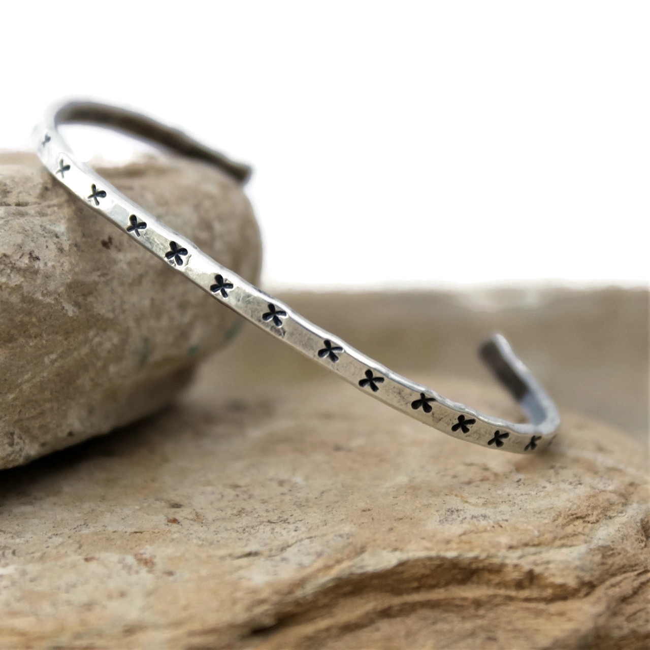 You will feel all that affection wearing this hammered and stamped sterling silver band. It's covered with those cute "X" kiss symbols all around. This is so sweet on its own or piled up and added to your favorite bracelet stack!