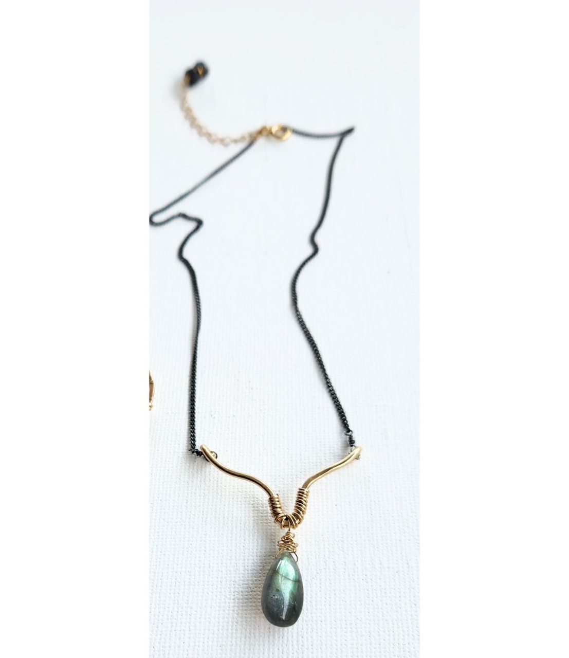 Now for the chain, it's not just any chain, it's blackened silver, giving it that edgy, badass vibe. And smack dab in the middle, there's this gold lotus shape hand formed. It's like the cherry on top, symbolizing all things pure and enlightened amidst the cosmic chaos of the labradorite.