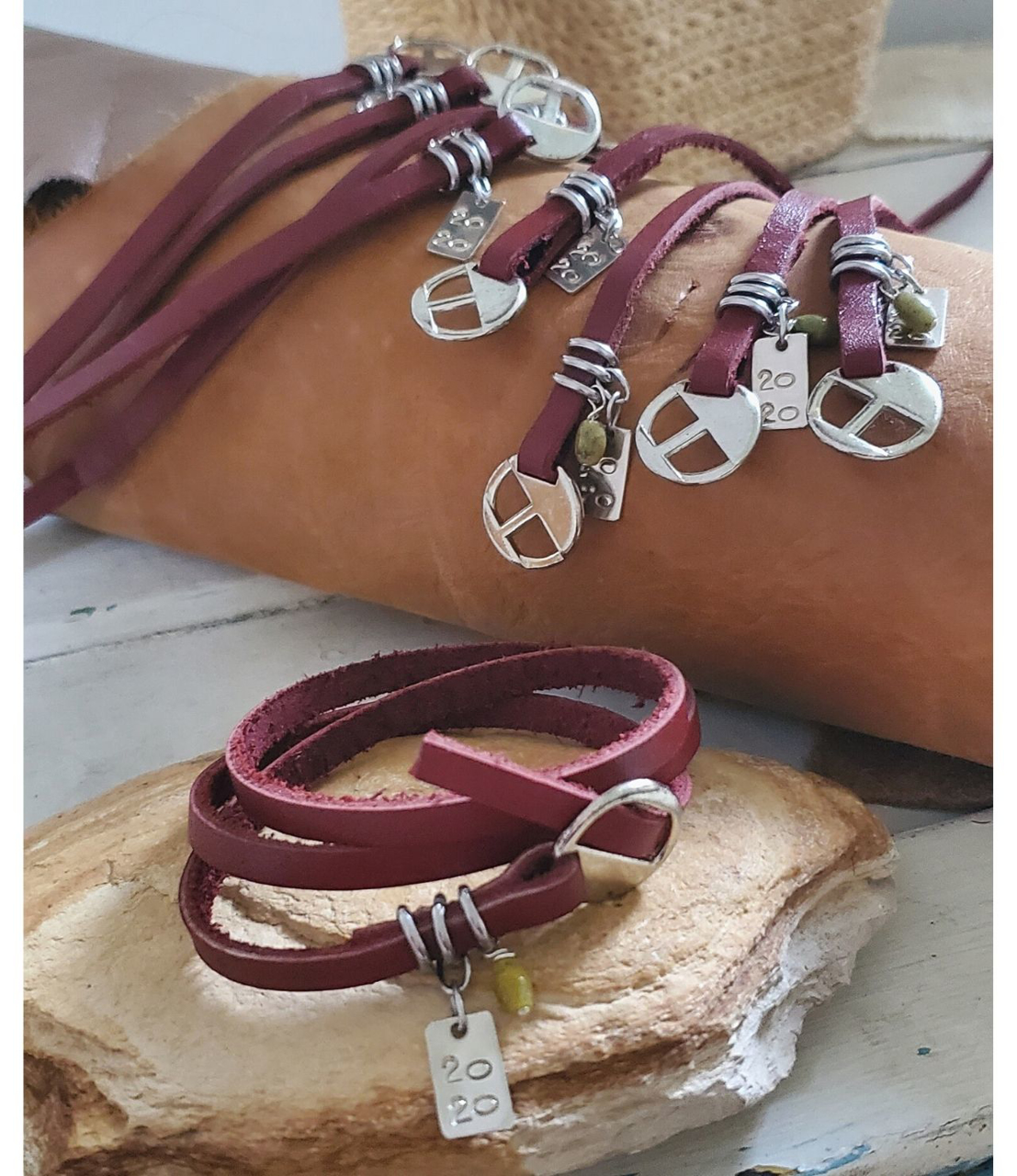 This party of nine family members preferred simple matching keepsake gifts. Leather wrap bracelets with a sidewways "2020" tag to represent this sideways year. A reminder of family bonding during unprecented times. beside the 2020 charm the gals get a small jade stone dangle for a liitle more holiday cheer.
