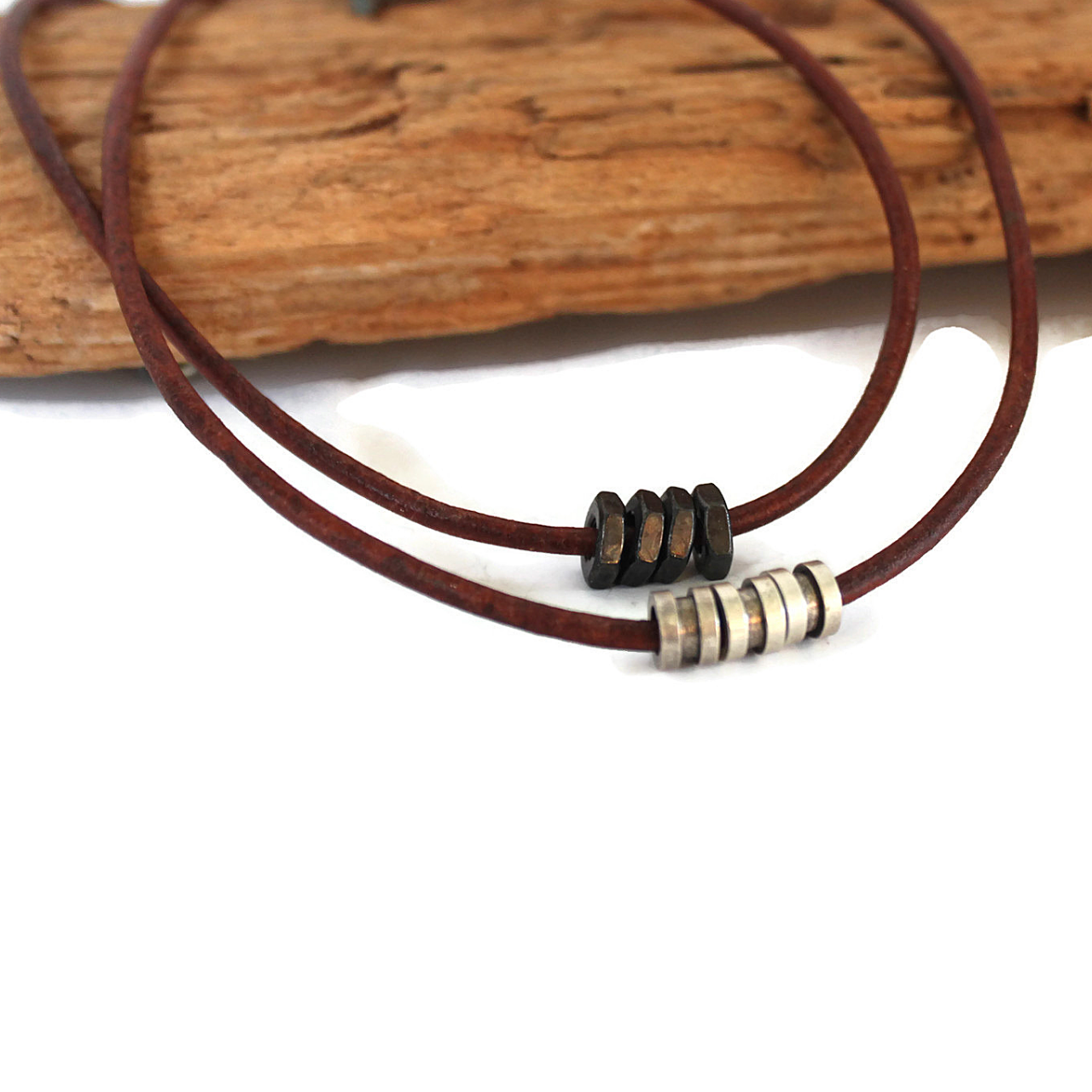 Add a touch of handsome to your wardrobe with our men's leather cylinder necklace. Urban style with comfortable brown leather and burnished two-tone cylinders.