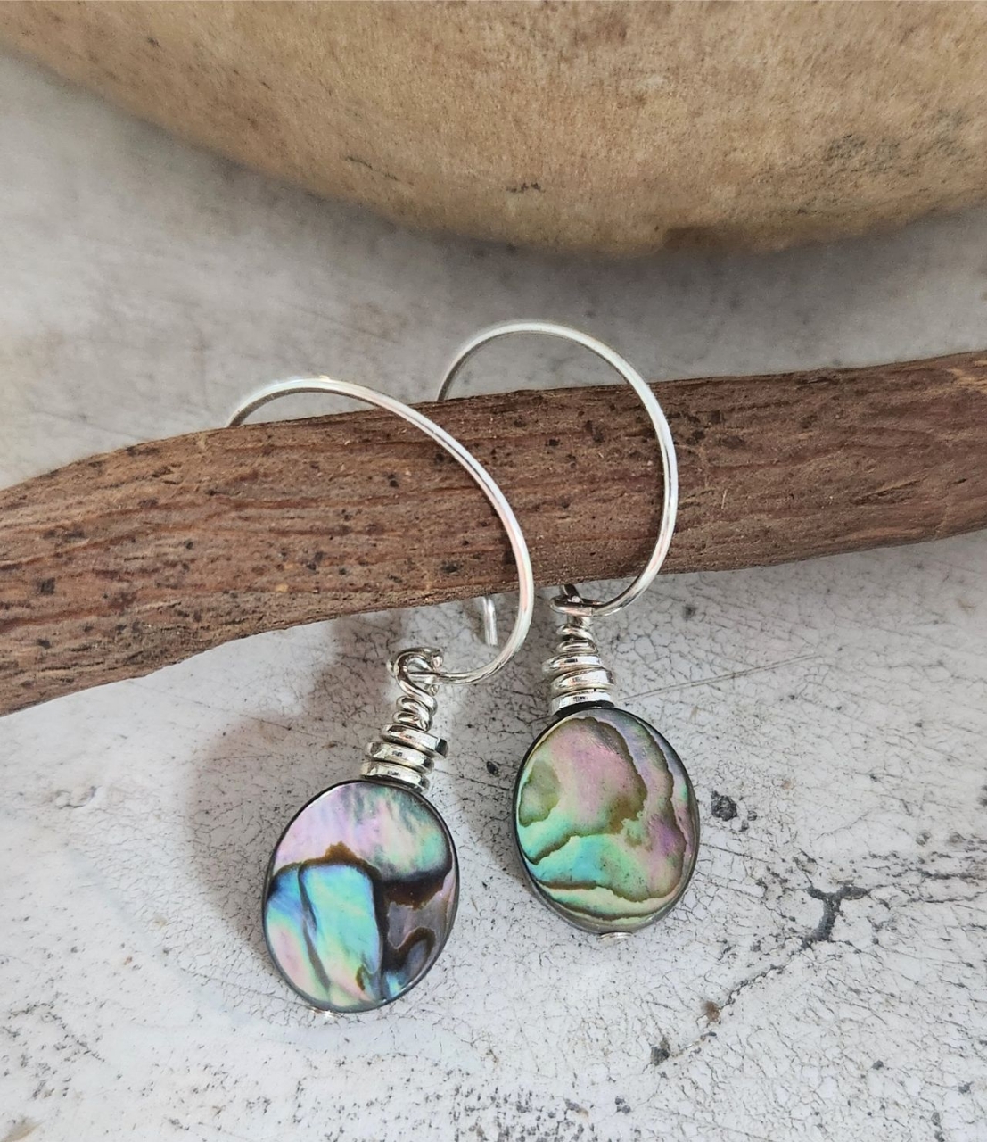 Embrace the iridescent beauty of the sea with the Ocean Glow Hoops. These silver mini hoops feature captivating abalone dangles that shimmer with hues of blue, green, and violet, reminiscent of ocean waves catching the sunlight.