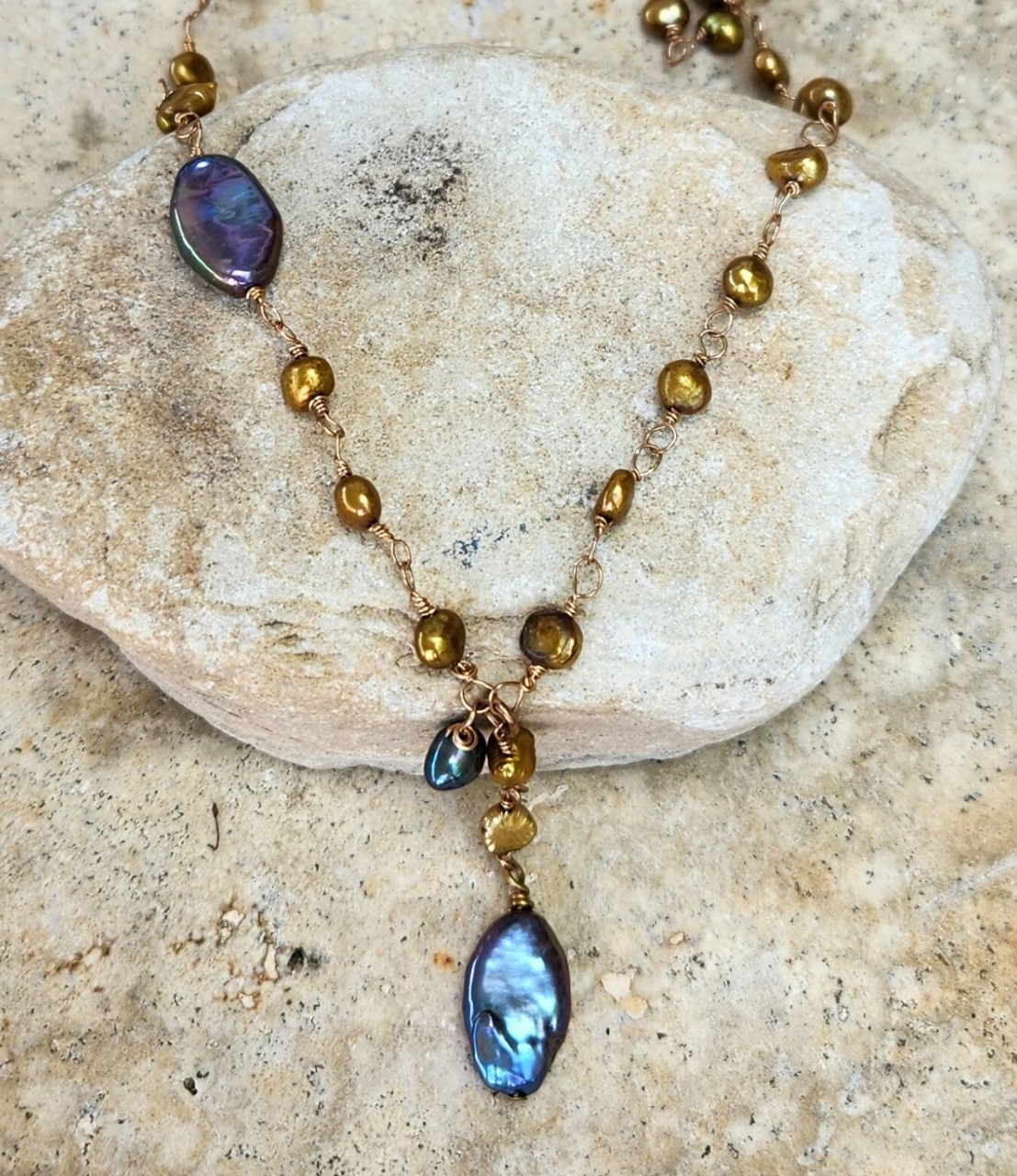 Old world charm coming to you with rich tones in a peacock blue, green, gold, pearl Y necklace.
