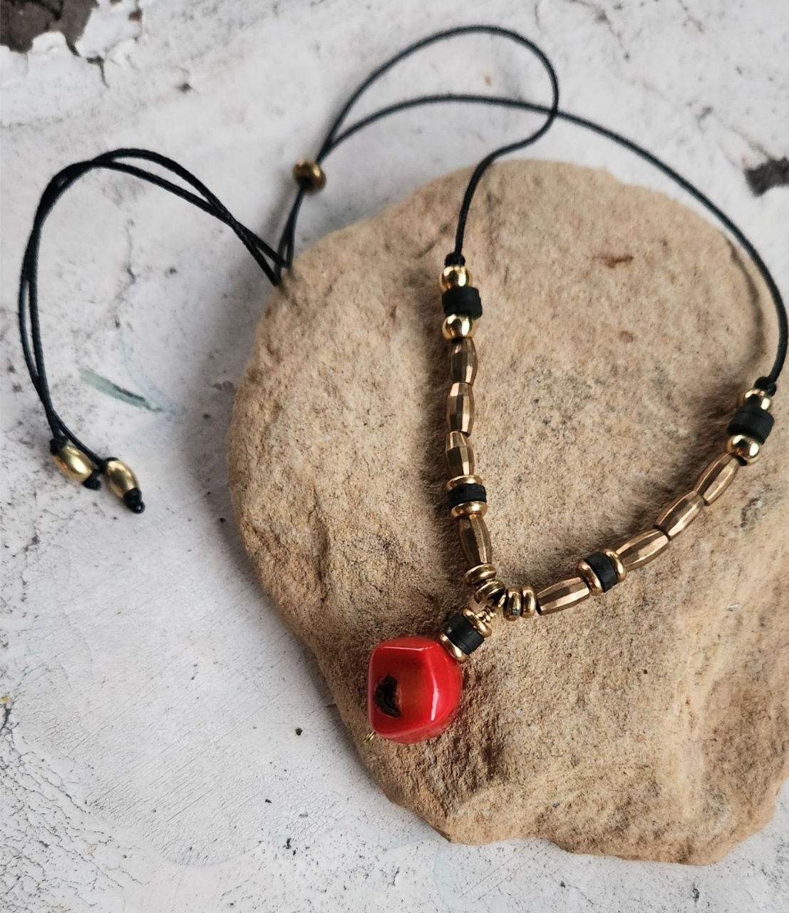 Bold, boho, and a little rebellious — this red coral and raw brass necklace is all about making a statement. The vibrant coral brings the heat, while the untreated brass develops its own patina over time, so your piece gets even cooler as you wear it. Perfect for mixing with prints, patterns, and all the color — Johnny’s here to turn every outfit into a vibe.