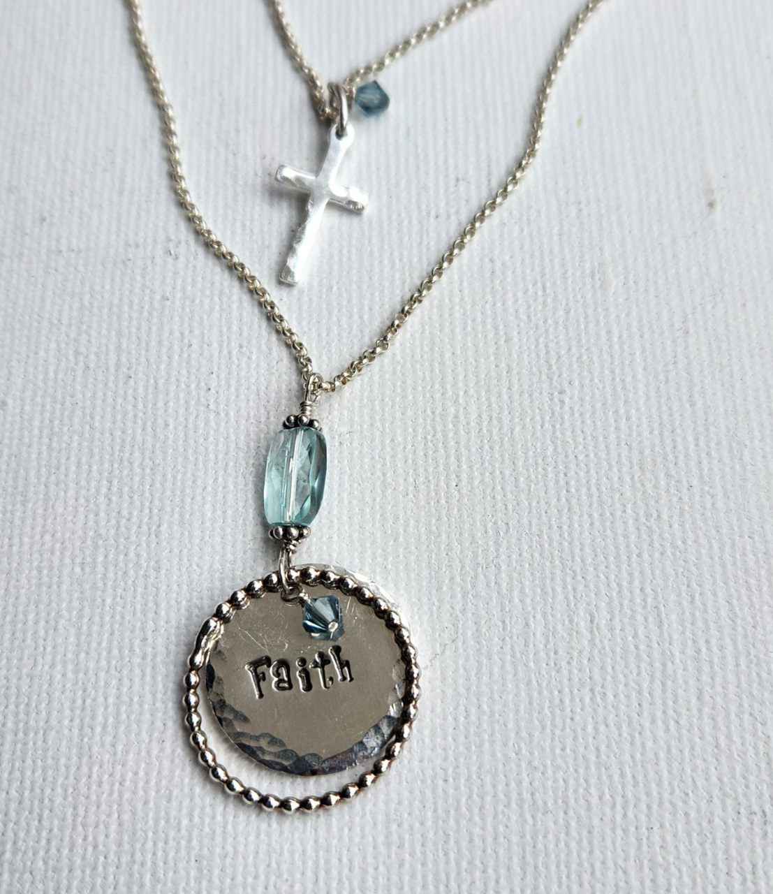 The silver chain neckace has a charm on each layer - a hammered silver cross, and a hammered faith charm with beaded ring. This simple design gets straight to the point!