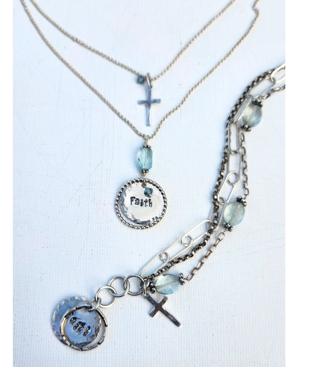 A whole bunch of faith for Stacy with a sterling silver, multi-chain blue gemstone, cross and faith charm jewelry. A bracelet and complimentary necklace was requested! Handcrafted, hammered, stamped and wired with love for this gal!