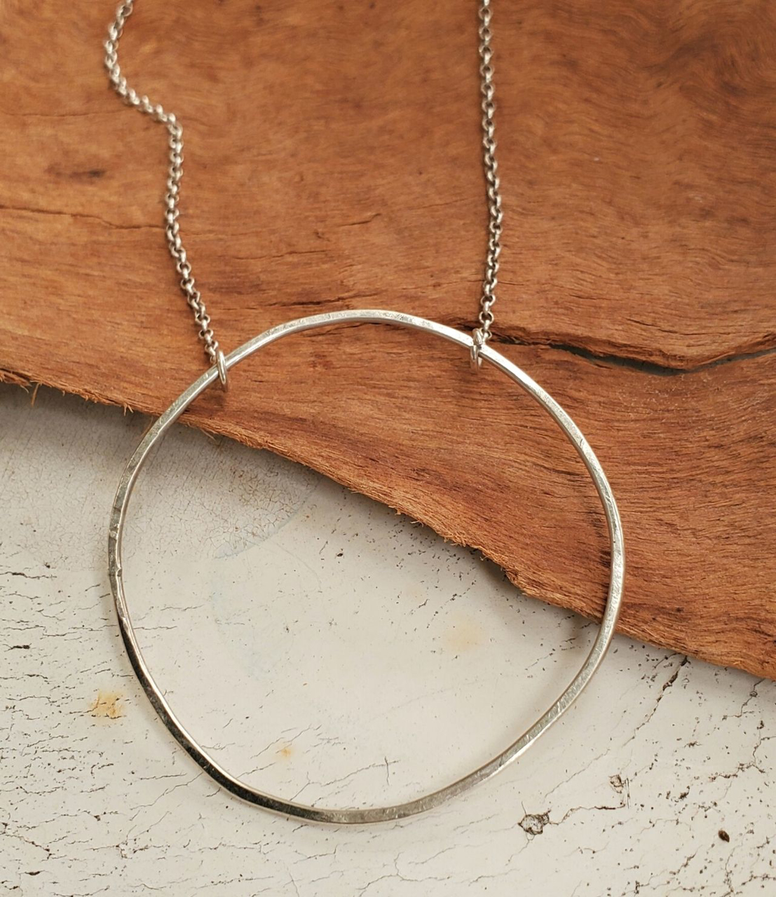 A statement making, big, sterling silver circle necklace. Lightly hammered, organic in shape, beautifully simple. This circle represents the cycle of cause and effect - getting what you give.