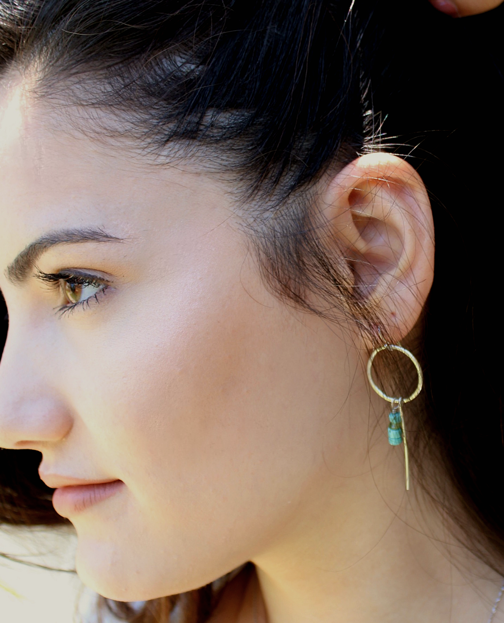 Streamlined sterling hoop stick with turquoise & peridot earrings offer all-day comfort and a pop of pretty color. Jazz up your day with this lightweight and cute design.