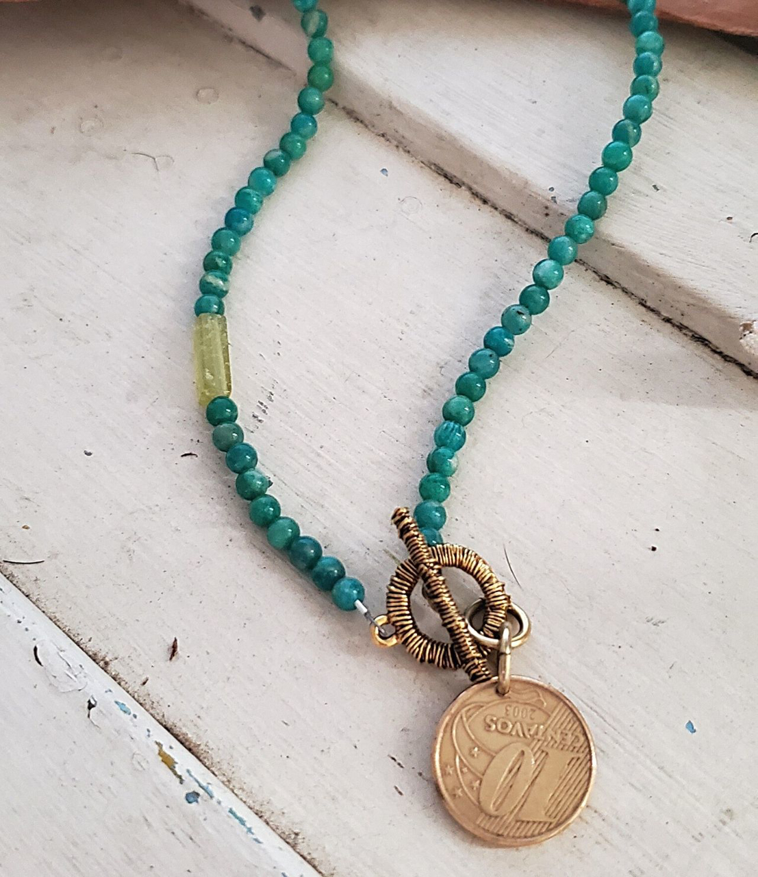 Cheerful turquoise and green stones make up this 2003 Brazil coin necklace. The front toggle clasp filled with detailed design allows for easy on/off. Both sides of the coin can be enjoyed by depending how you choose to wear. A long lasting keep sake with a beautiful coin.