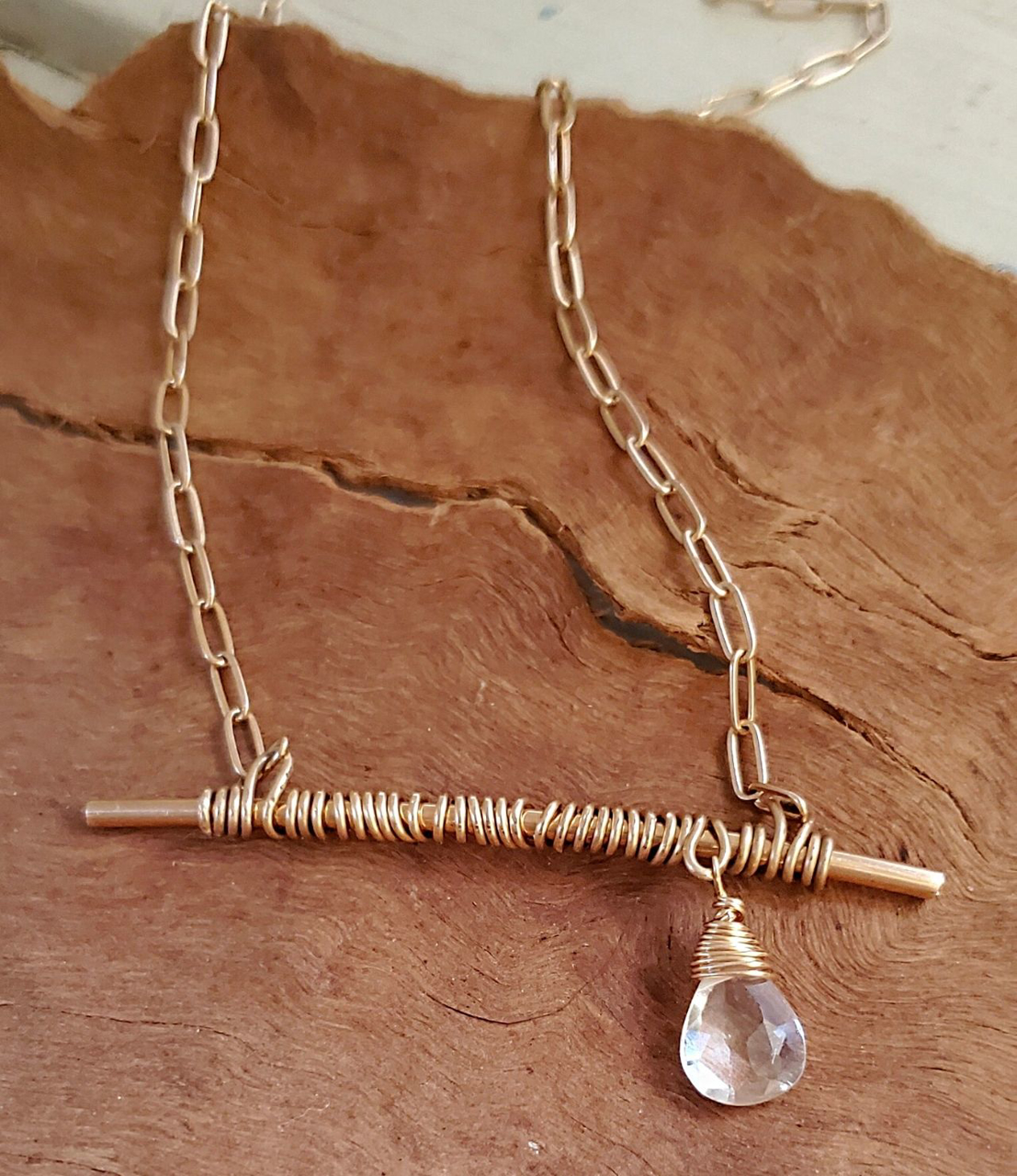 Bar none is how you'll feel wearing this simple (but oh so eye catching) necklace. A wire wrapped bronze bar with a sweet diamond quartz stone that hangs from bronze paperclip chain. She is super pretty worn alone but is also a great one for layering. And you have options