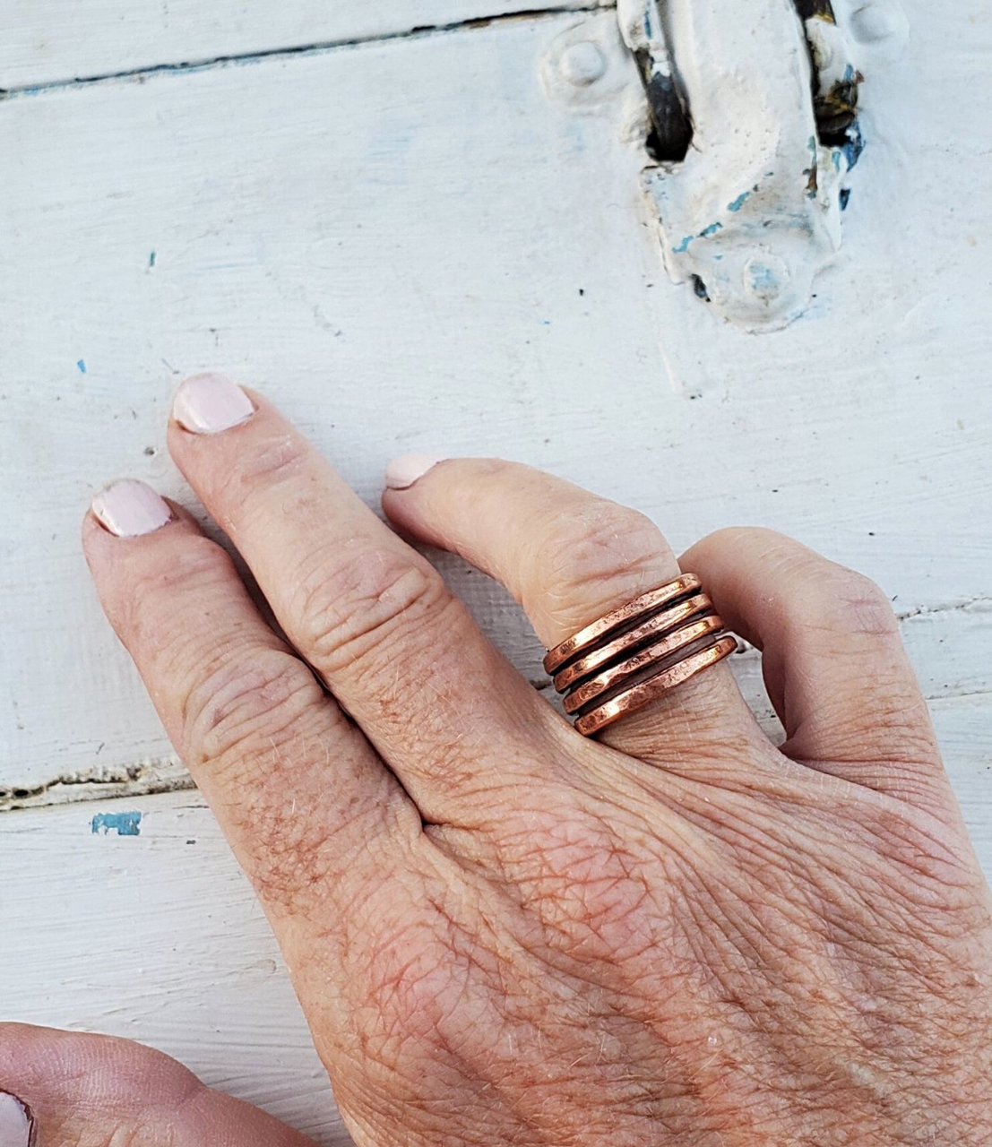 Your fingers will enjoyed the benefits of wearing a coiled copper ring on any finger. Hand forged solid copper is loaded with antimicrobial benefits to help keep you protected. Easy to wear on your pointer, middle and ring fingers. Also stacks well with others! (see photo)