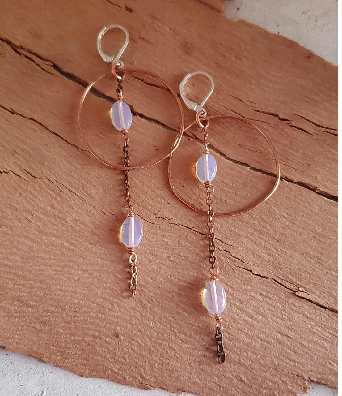 Long dangling feminine copper hoop opalite earrings for feeling your prettiest. While these earrings are long, don't go thinking they are heavy! They are super duper light as can be. The two iridescent opalite stones are gorgeous paired with copper metal. And these stones can serve as the birthstone for October. A very lovely madmade version of opals!
