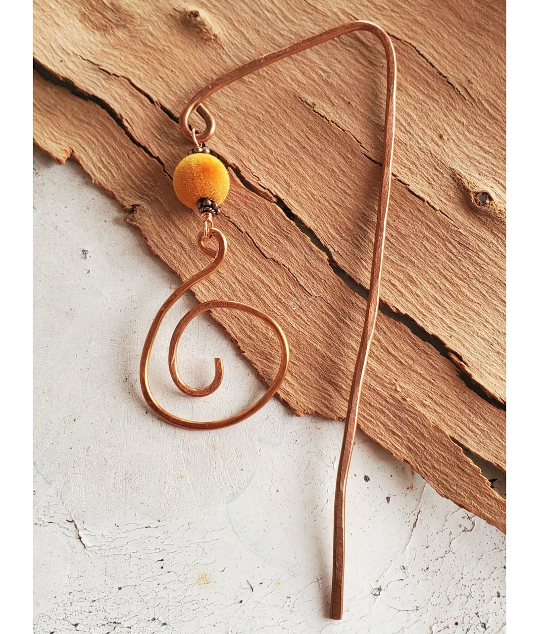 A hand forged copper spiral bookmark with orange pom-pom. Fun playful design that will never let you loose your place again!