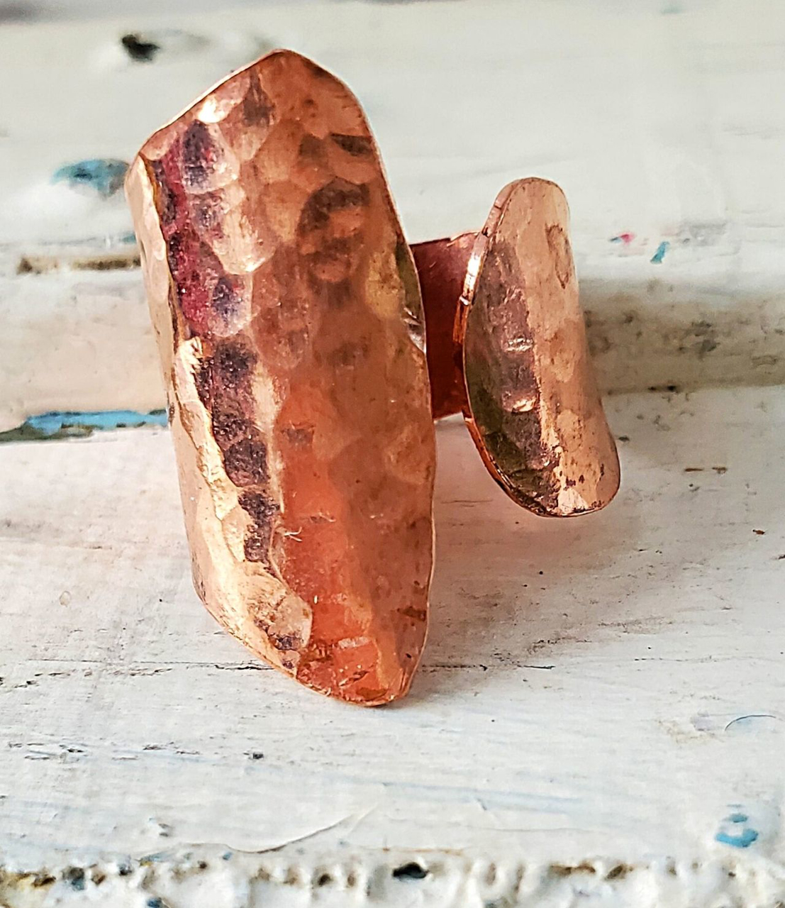 Ride the wave wrap ring in hammered copper or brass metal. This ring looks particularly good on your middle and pointer fingers.