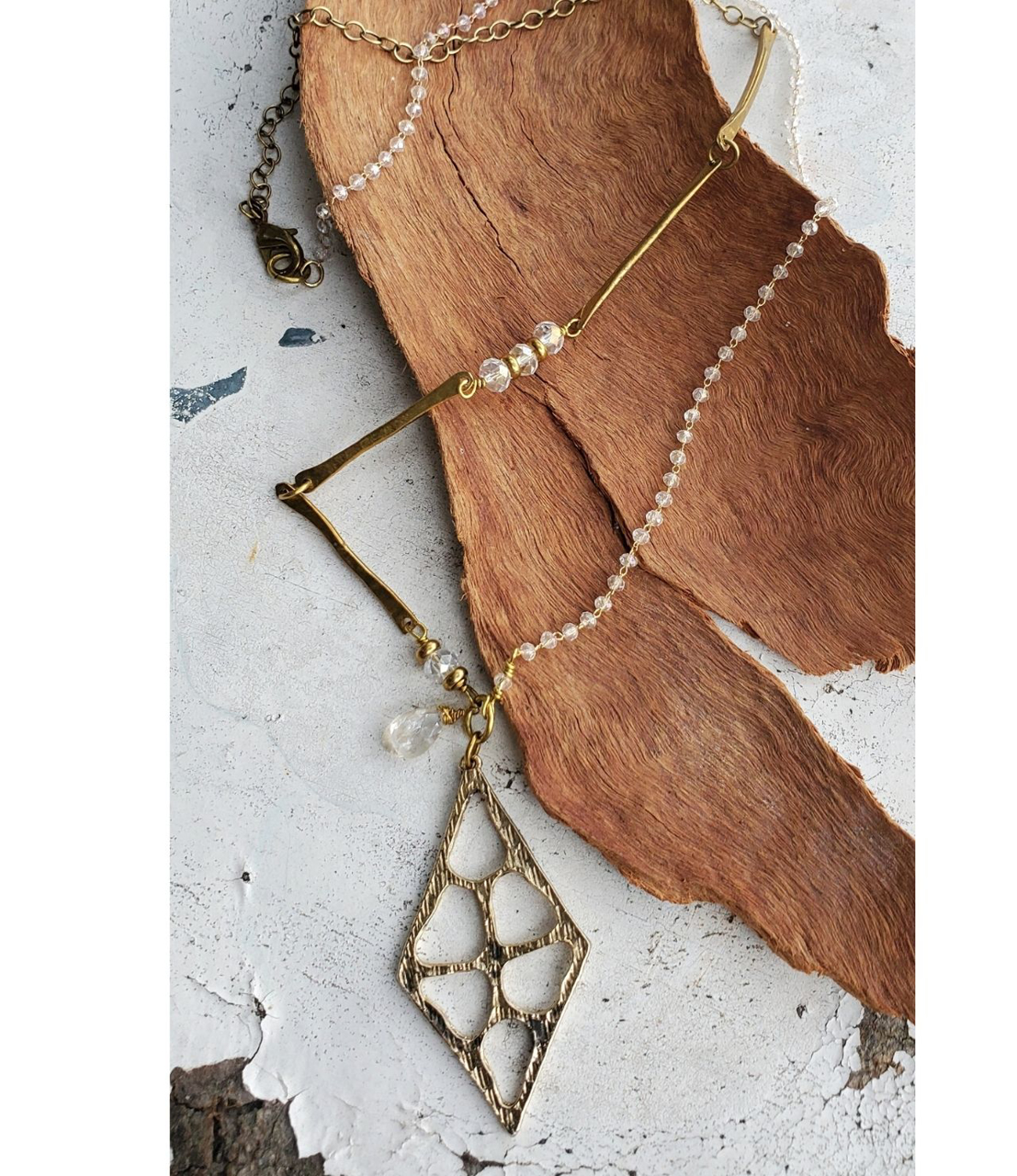 Hammered bars of brass, sparkly crystal chain, diamond quartz and diamond shape paw print pendant form this Diamond Girl necklace. Not only was Diamond a service dog but she became a life line to her dearest owner. Diamond gave so much love, heart and soul. Long live Diamond and how she made you feel. Custom designed for Eileen. Diamonds human mom.