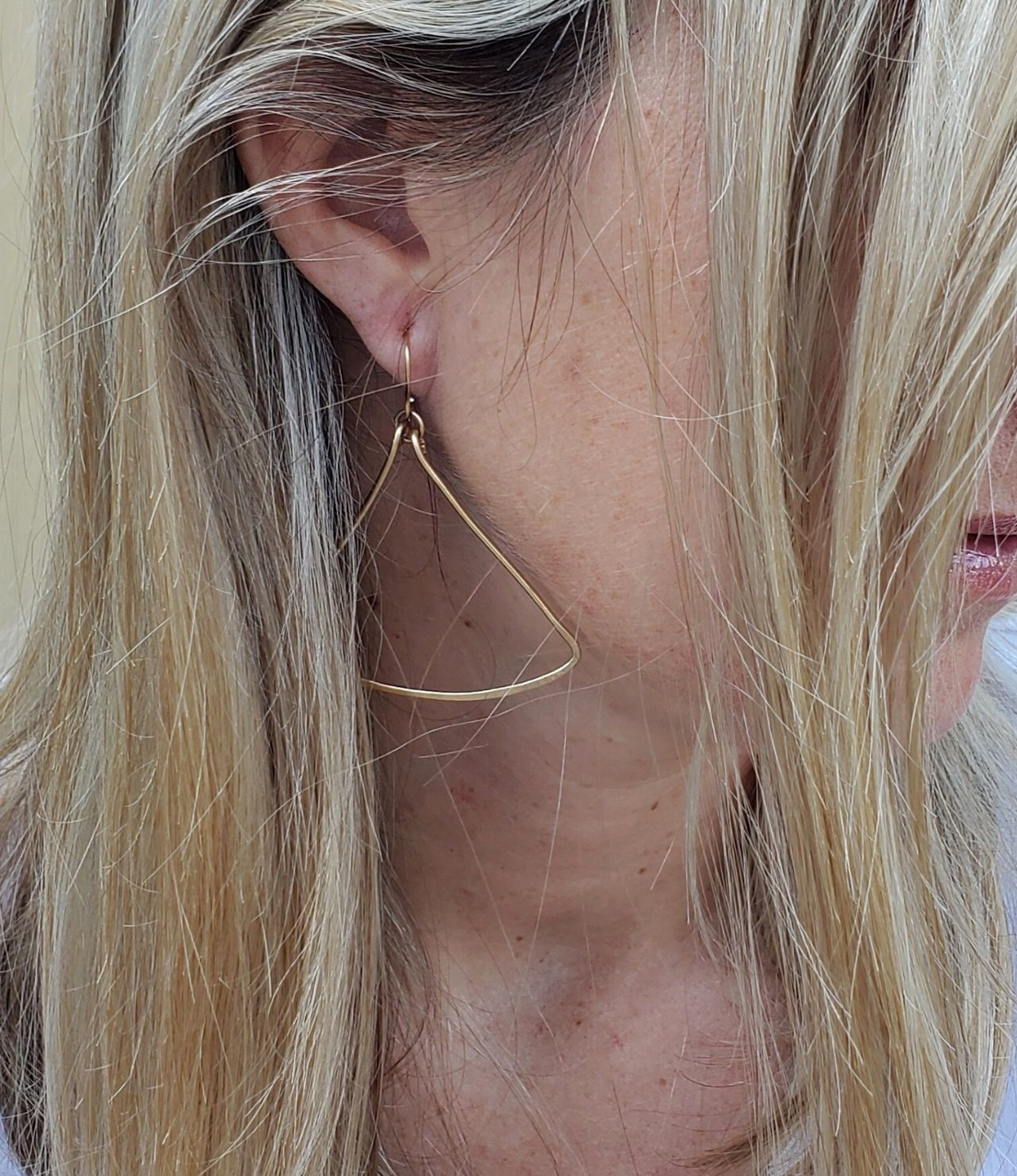Feel an upswing with simple hand forged gold triangle earrings. Triangles represent so many things from culture to culture. One of them is, positive change I think we could all agree that changing for the better is good. Might as well feel pretty while your at it.