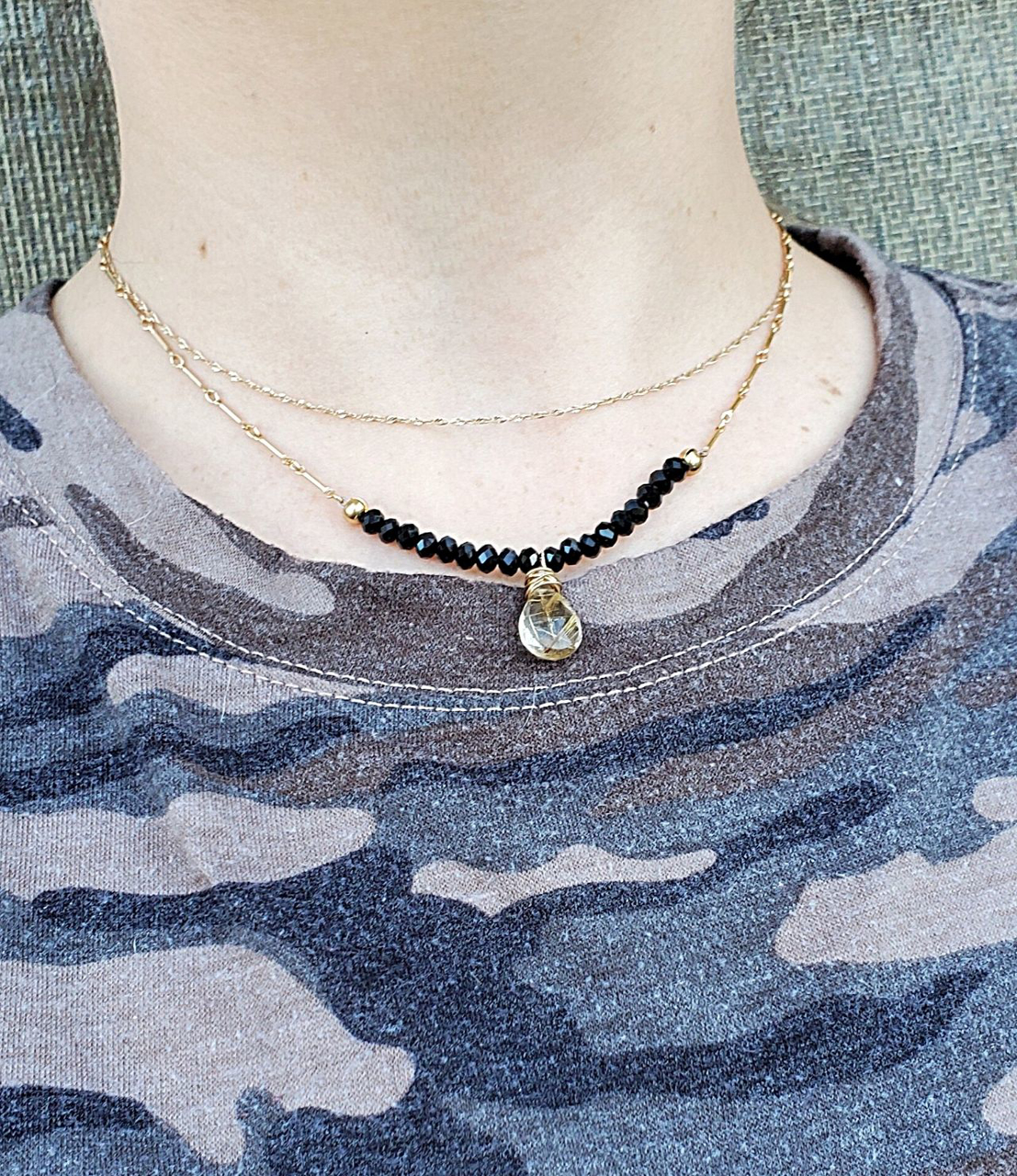 Gold bar chain with a row of black faceted crystals features a beautiful rutilated quartz. Rutilated quartz is a variety of quartz which contains acicular inclusions of rutile. These inclusions mostly look golden, but they also can look silver, copper red or deep black.