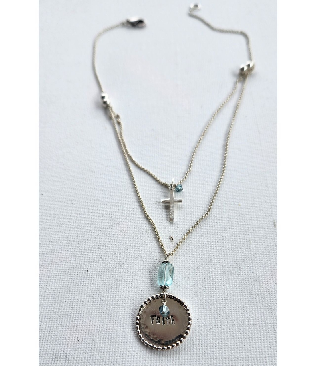 The silver chain neckace has a charm on each layer - a hammered silver cross, and a hammered faith charm with beaded ring. This simple design gets straight to the point!