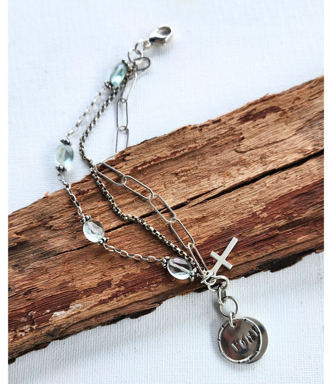The softest light blue quartz stones look so rich wired within the bracelet chain. A variety of mixed silver chain with a cross charm and hammered faith charm are meaningful pieces to hang with grace from the wrist.