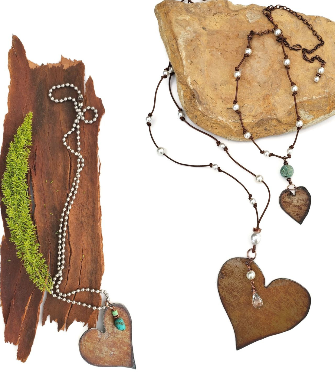 The two custom necklaces on the left side are companion necklaces. This means they are complimentary when worn together or can easily be worn alone. These necklaces feature soft brown leather cord and white pearls. One has a long sparkly Swaroski crystal hanging from heart. The other features the same brown leather, pearls closer together and a big round faceted blue/green fire agate stone.