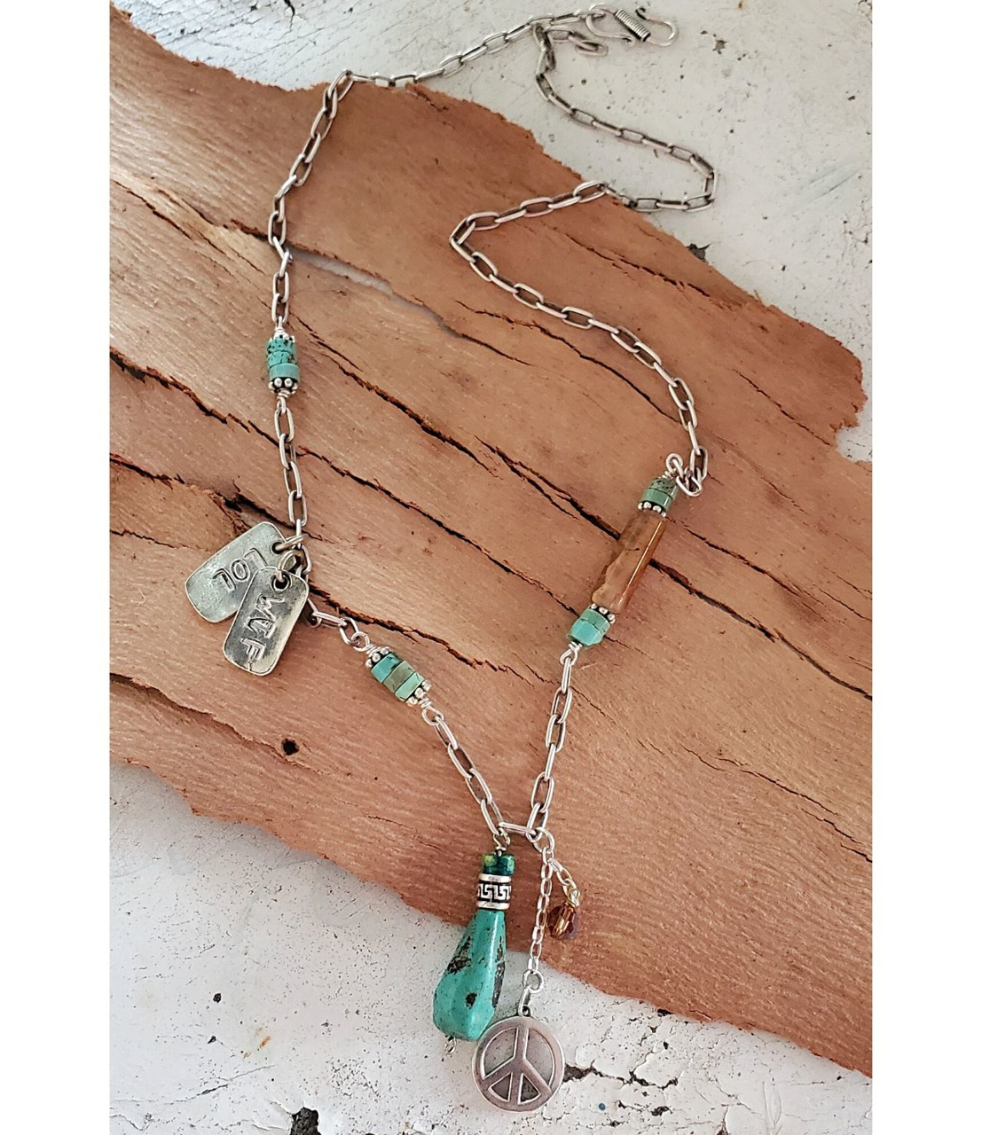 One of a kind, turquoise, peace charm, silver chain necklace is as unique as you are! This blend of silver, turquoise and golden brown is true earthy artisan jewelry. With a peace charm front and center and tags that read WTF and LOL its full of meaning:)