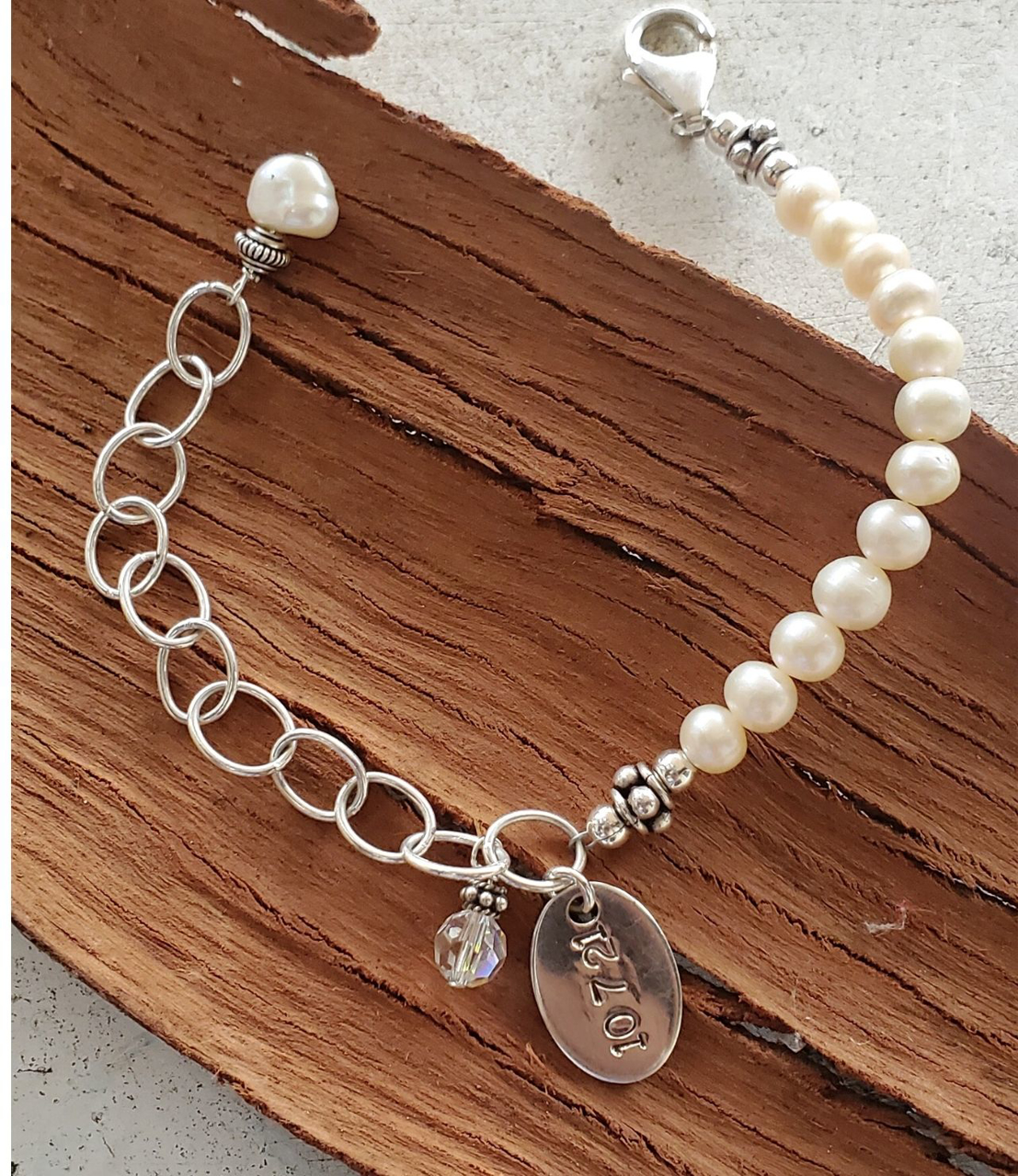 The prettiest white pearl silver chain new mom charm bracelet is a long lasting keepsake. The classic bracelet also includes a hearty sterling silver charm with baby M's initials and her birthdate on back side. The chain allows plenty of room for more babes to come!